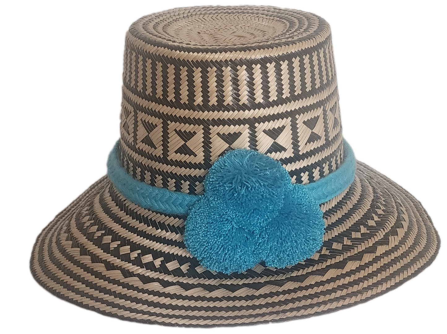 Celebrate bold bohemian beauty with this colorful handmade straw hat, featuring vibrant turquoise pompoms and a matching band. Crafted from natural Iraca palm and handwoven by skilled Wayuu artisans, this statement piece blends tradition with fresh, modern flair.