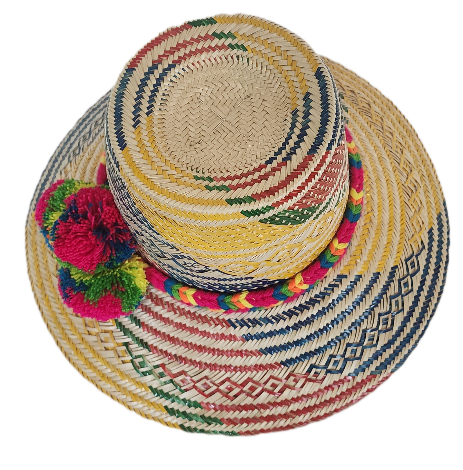 Discover the vibrant, handmade Wayuu Hat, a unique artisan treasure, expertly woven from high-quality Iraca palm fibers by gifted Wayuu artisans across Colombia and Venezuela. Each hat represents about 8 hours of dedicated craftsmanship, transforming natural materials into a unique, colorful piece of wearable art.