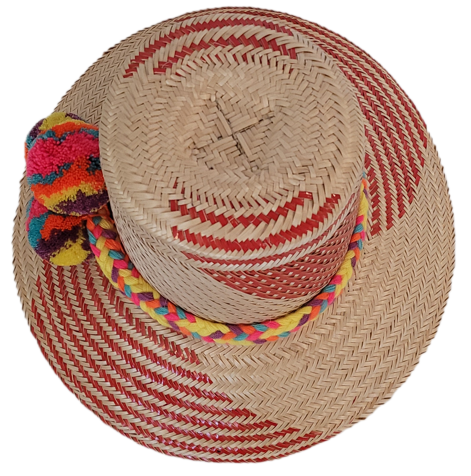 The Mia Handmade Wayuu Hat is bursting with color and character. Handwoven from natural Iraca palm, it features a striking red diagonal weave design and a braided band in yellow, pink, turquoise, and red. The playful pompom trio, echoing the same vivid tones, creates a lively contrast that radiates joy and cultural pride.