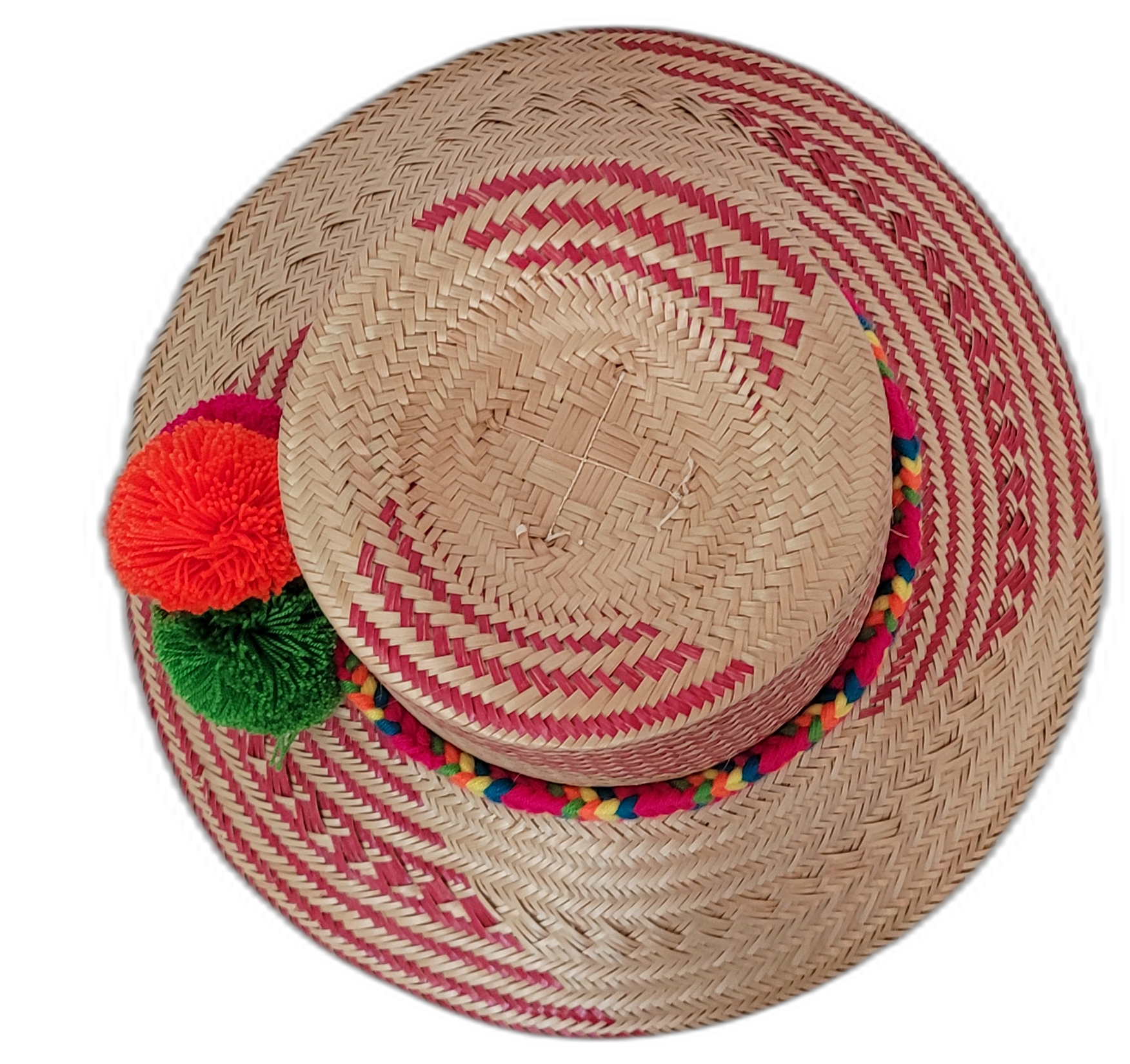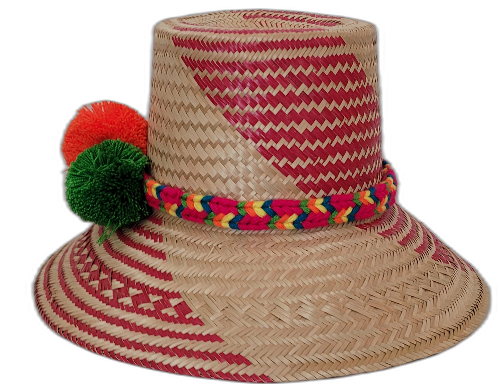 Radiate with color and heritage in the Payton Boho Hat, a vibrant, handmade Wayuu straw hat expertly woven by Indigenous Wayuu artisans of Colombia and Venezuela. Each hat is a one-of-a-kind work of wearable art, crafted from high-quality Iraca palm and designed with striking crimson red and natural straw beige diagonal patterns. The band is wrapped in a bold rainbow weave and adorned with red, orange, and green pompoms — each color symbolizing joy, energy, and abundance.